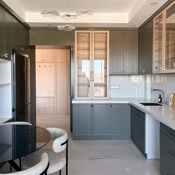 For optimal functionality, we’ve embraced the L-shaped kitchen layout, offering a practical and efficient countertop design. Complementing this, floor-to-ceiling cabinets hidden behind doors are a preferred choice, providing easy access to kitchen essentials and maintaining a streamlined aesthetic.