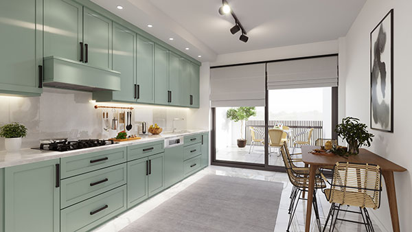 For optimal functionality, we’ve embraced the L-shaped kitchen layout, offering a practical and efficient countertop design. Complementing this, floor-to-ceiling cabinets hidden behind doors are a preferred choice, providing easy access to kitchen essentials and maintaining a streamlined aesthetic.